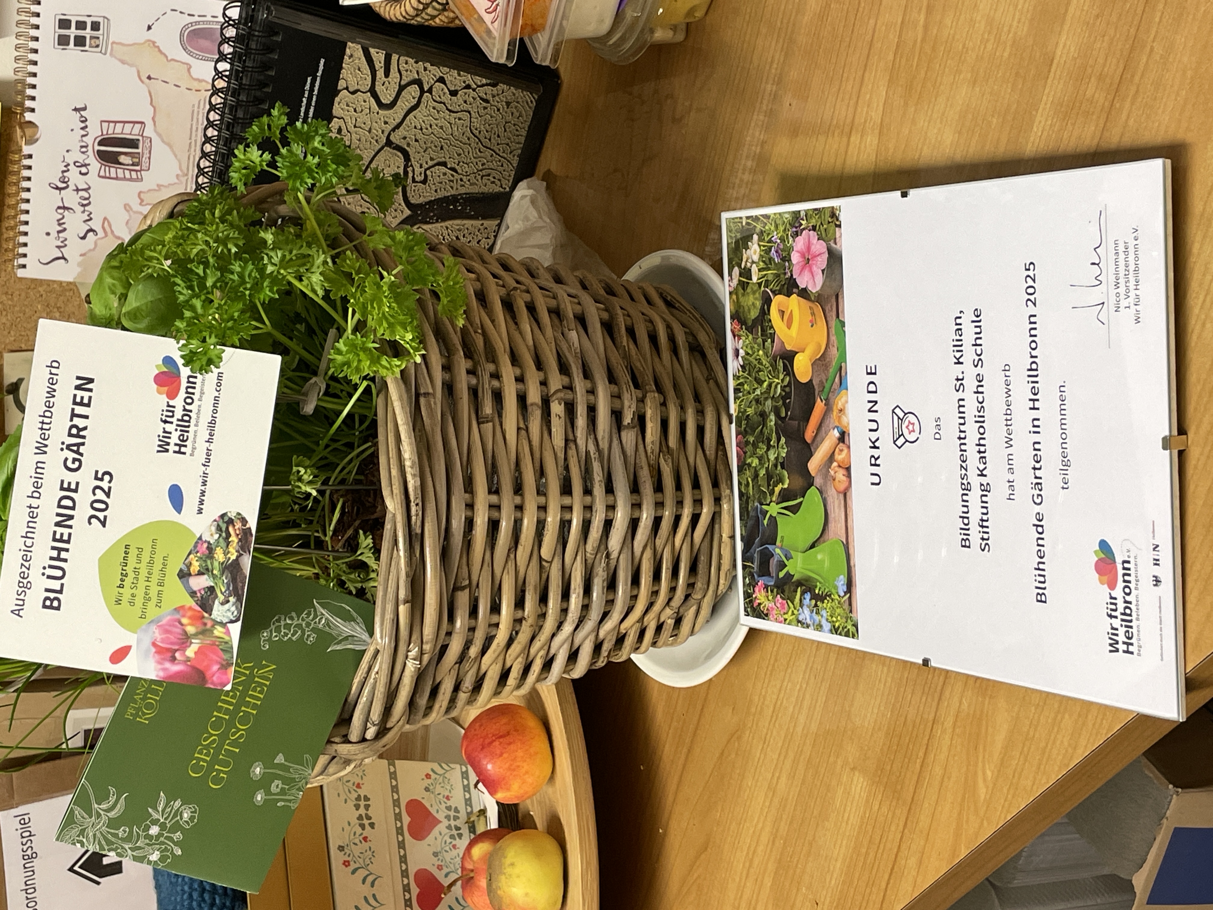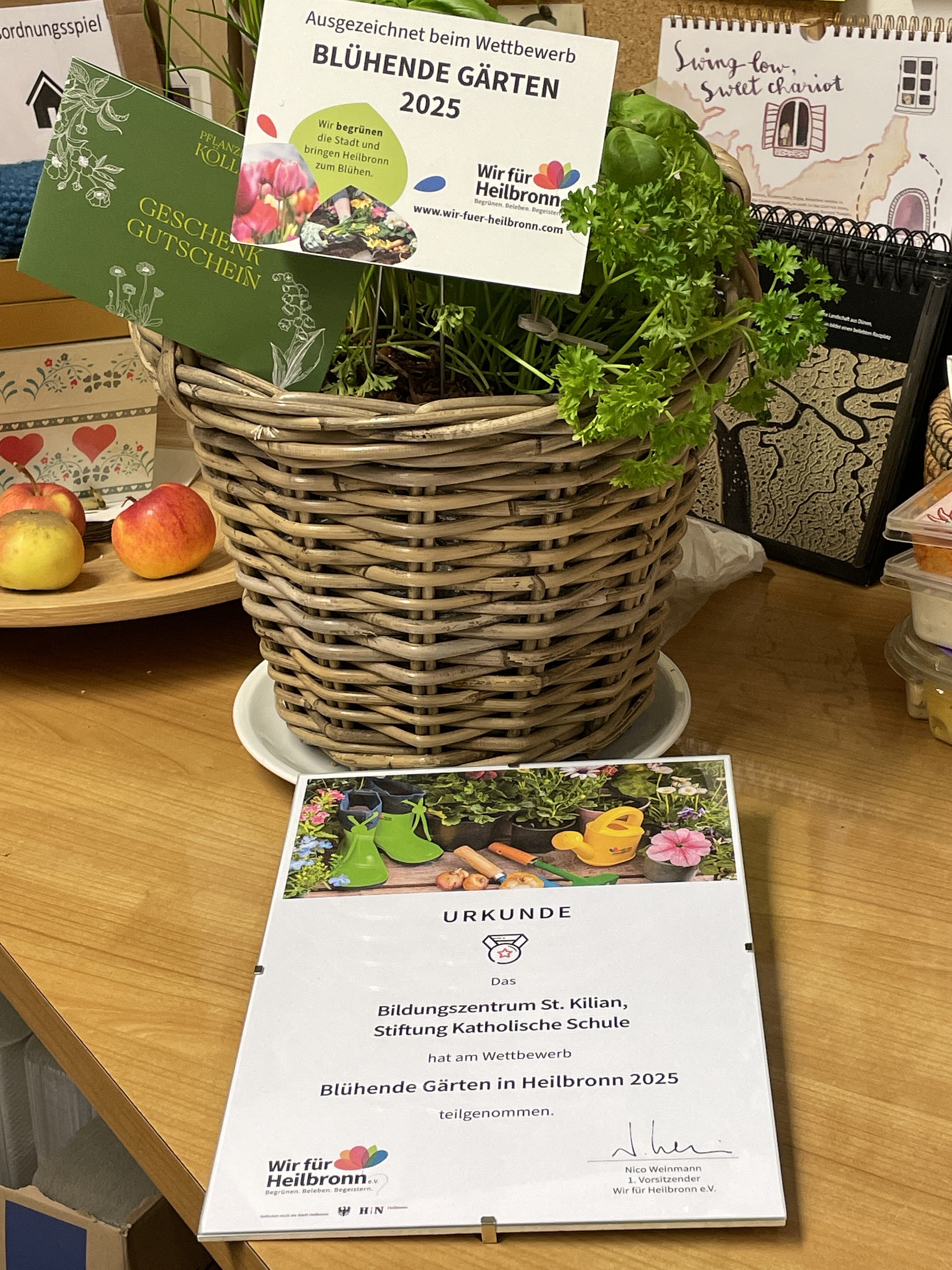 Wir gratulieren ganz herzlich unseren Klassen 7a-d, die im letzten Schuljahr unter der Leitung von Frau Kandora-Robin am Wettbewerb "Blühende Gärten - Wir für Heilbronn", teilgenommen haben. Vor allem das pädagogische Konzept und die Einbettung in die VU-Themen in Klasse 6 des Marchtaler Plans hat die Jury überzeugt und uns einen Platz unter den vier Gewinnern (von insgesamt 26 Teilnehmern) gesichert.