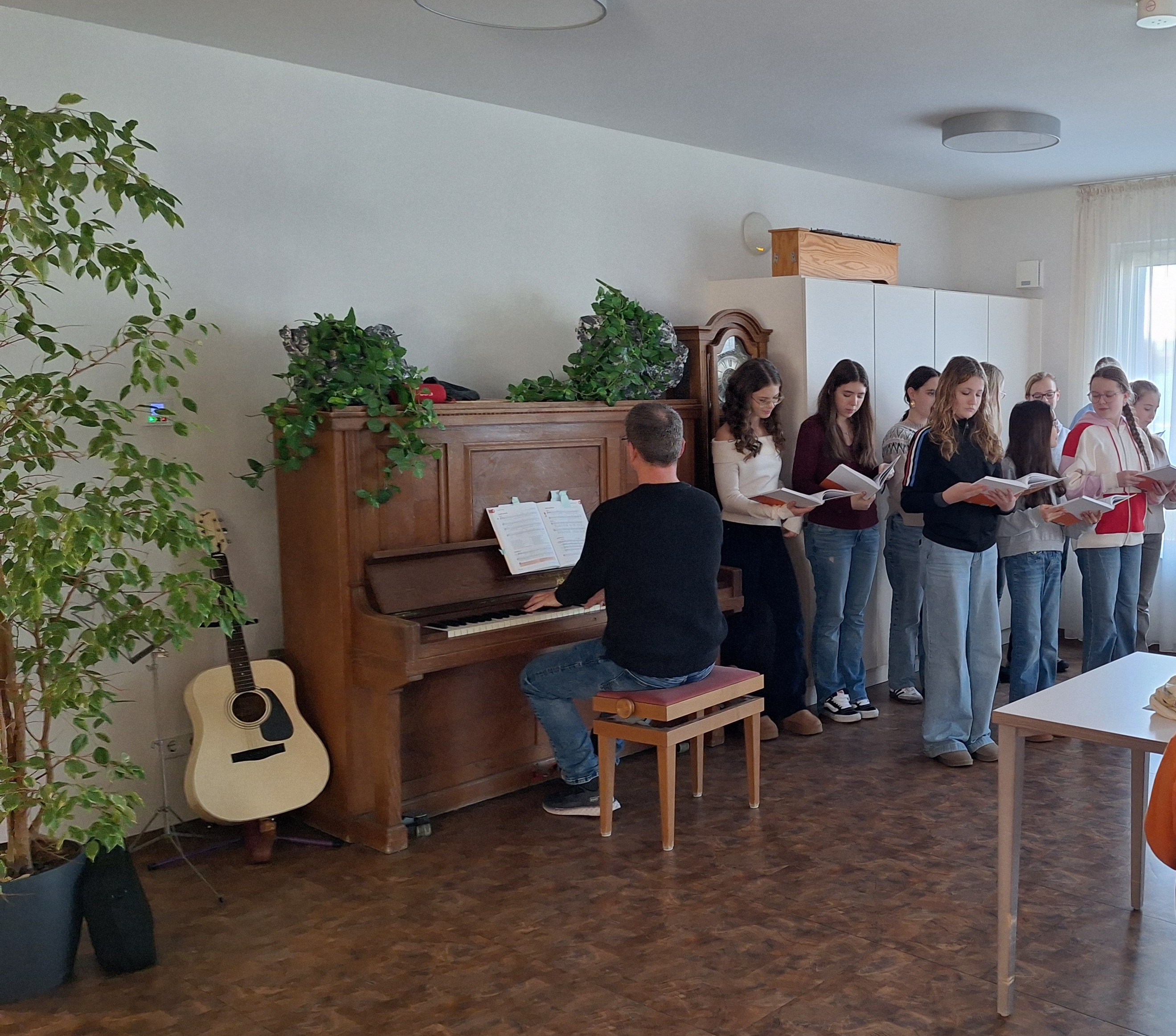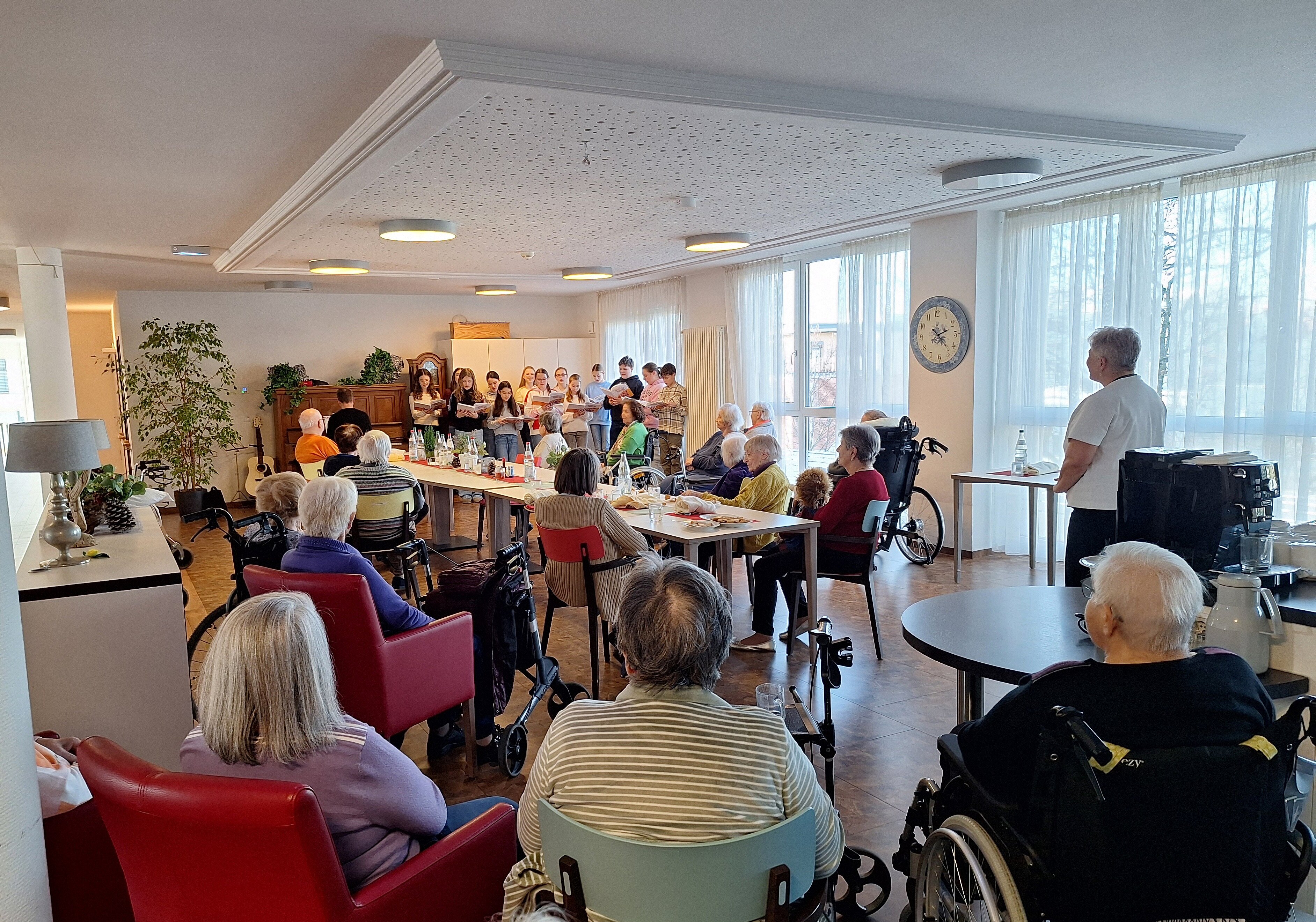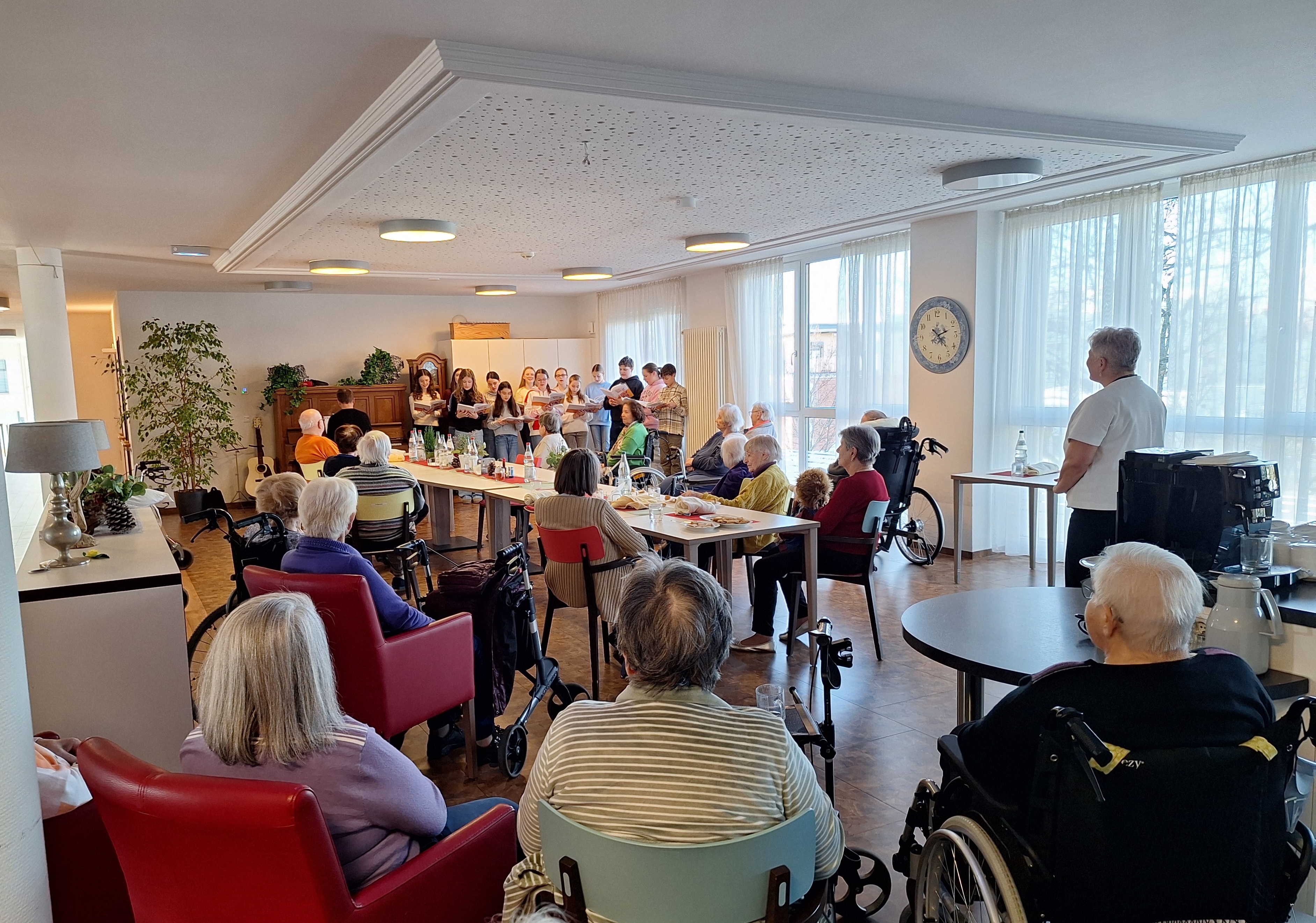 Bei Plätzchen und einer entspannten Atmosphäre hat der Mittelstufenchor im Rahmen des Friedensstifter-Bereichs für Solidarität und Nächstenliebe zusammen mit Herrn Farkas und Herrn Kusch die Pflegeeinrichtung „Haus zum Fels“ besucht. Unsere Musik, egal ob Klassiker wie „Wenn Menschen sich vergessen“ oder modernere Stücke wie „Wavin' Flag“, hat den SeniorInnen in einem vielleicht sonst von Trauer und Sorgen geprägten Alltag einen Lichtblick gegeben und ihnen gezeigt, dass Gott für alle Menschen da ist. Eine wunderbare zu unserem Jahresmotto passende Aktion: Wir als ChristInnen sollten allen Nächsten Momente der Hoffnung geben. Mit geistlichen Impulsen wurde der Nachmittag abgerundet. Der Name des Lieds „Smiling Faces“ beschrieb perfekt den Ausdruck in den Gesichtern der SeniorInnen. Zum Schluss gab es für alle, die mitgesungen haben, Gummibärchen. Wir freuen uns mit unserem Gesang den Menschen auch das nächste Mal, dann vielleicht nach Ostern, eine Freude zu machen.