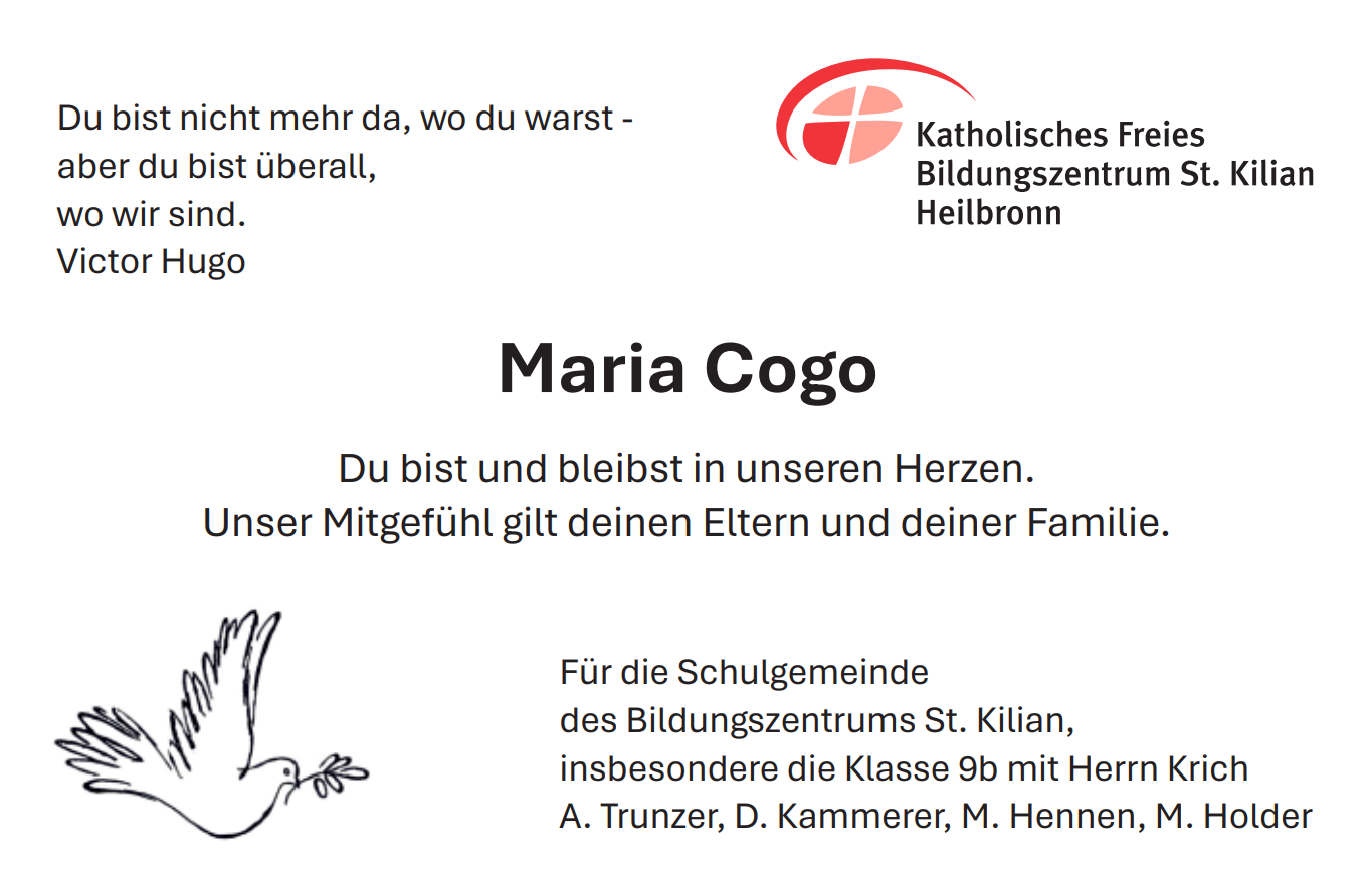 Wir gedenken und erinnern an unsere verstorbene Schülerin Maria Cogo und sind bei allen Trauernden im Kreise der Schulgemeinde und darüber hinaus.