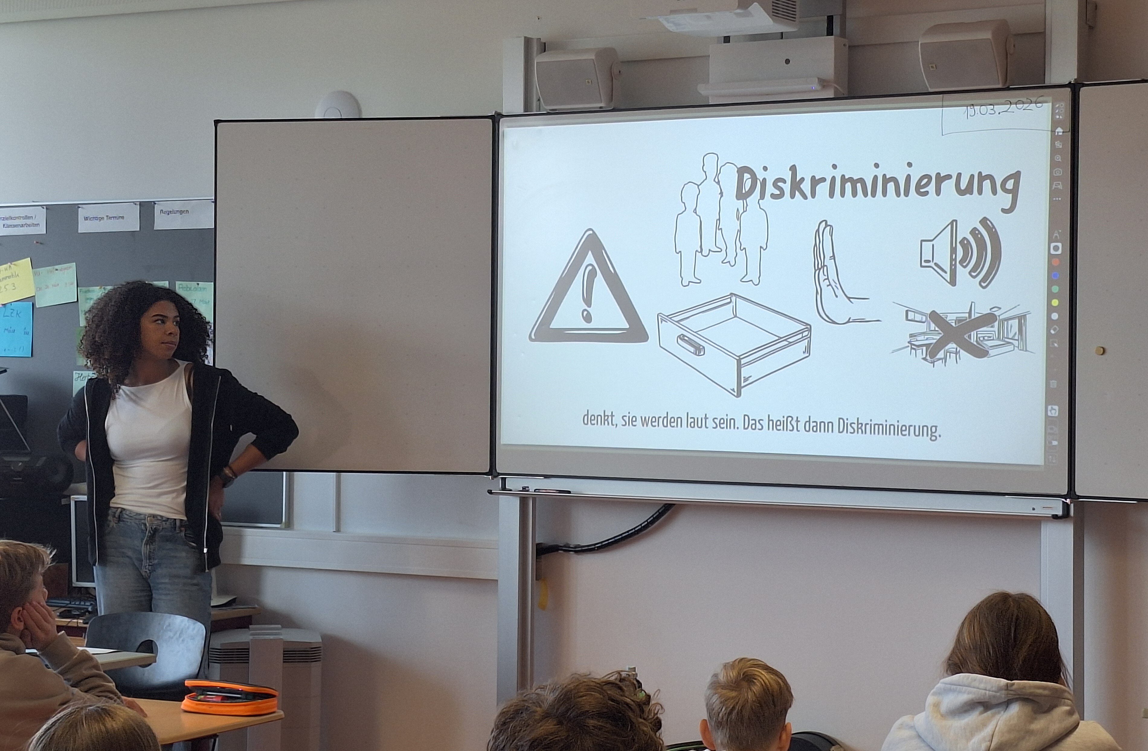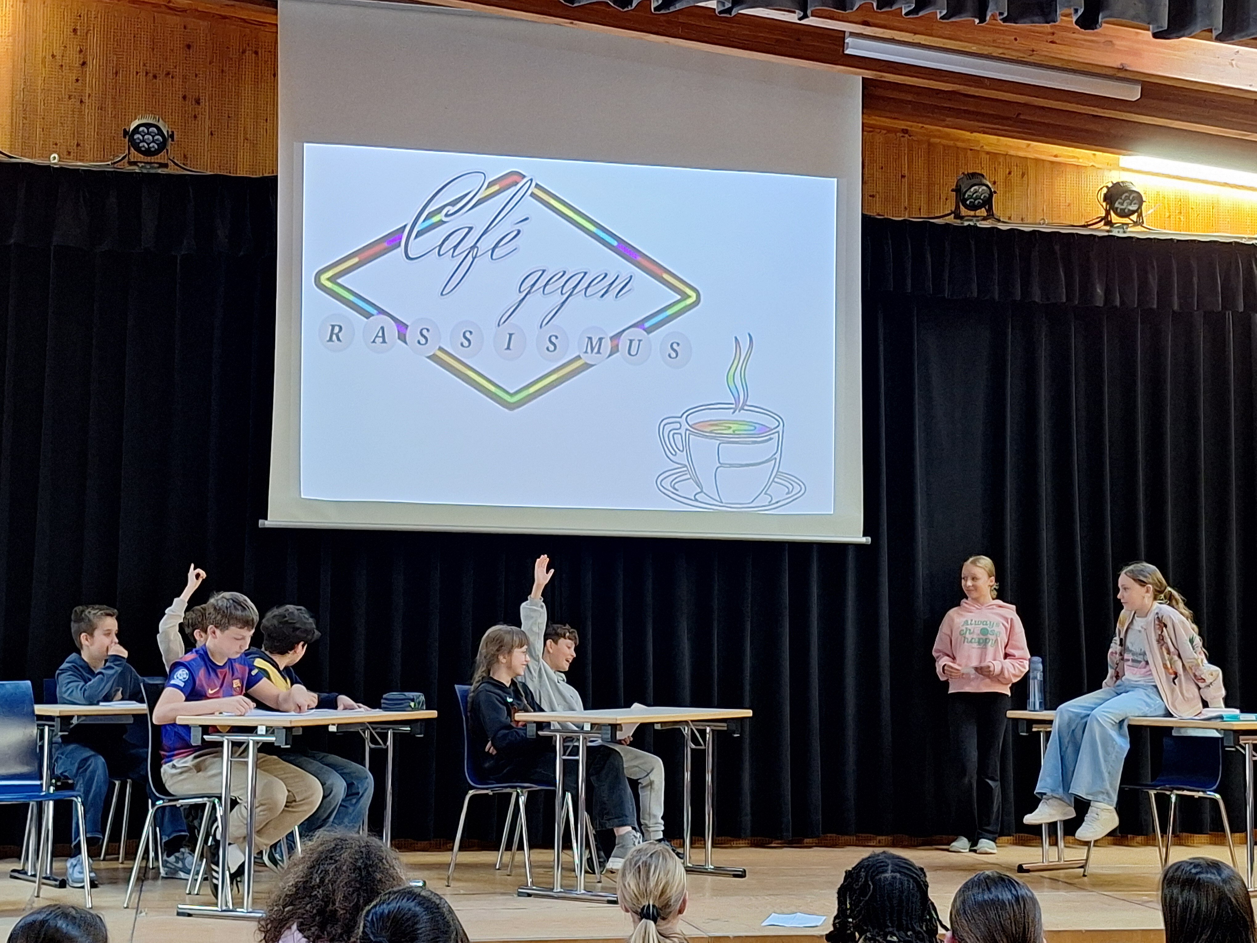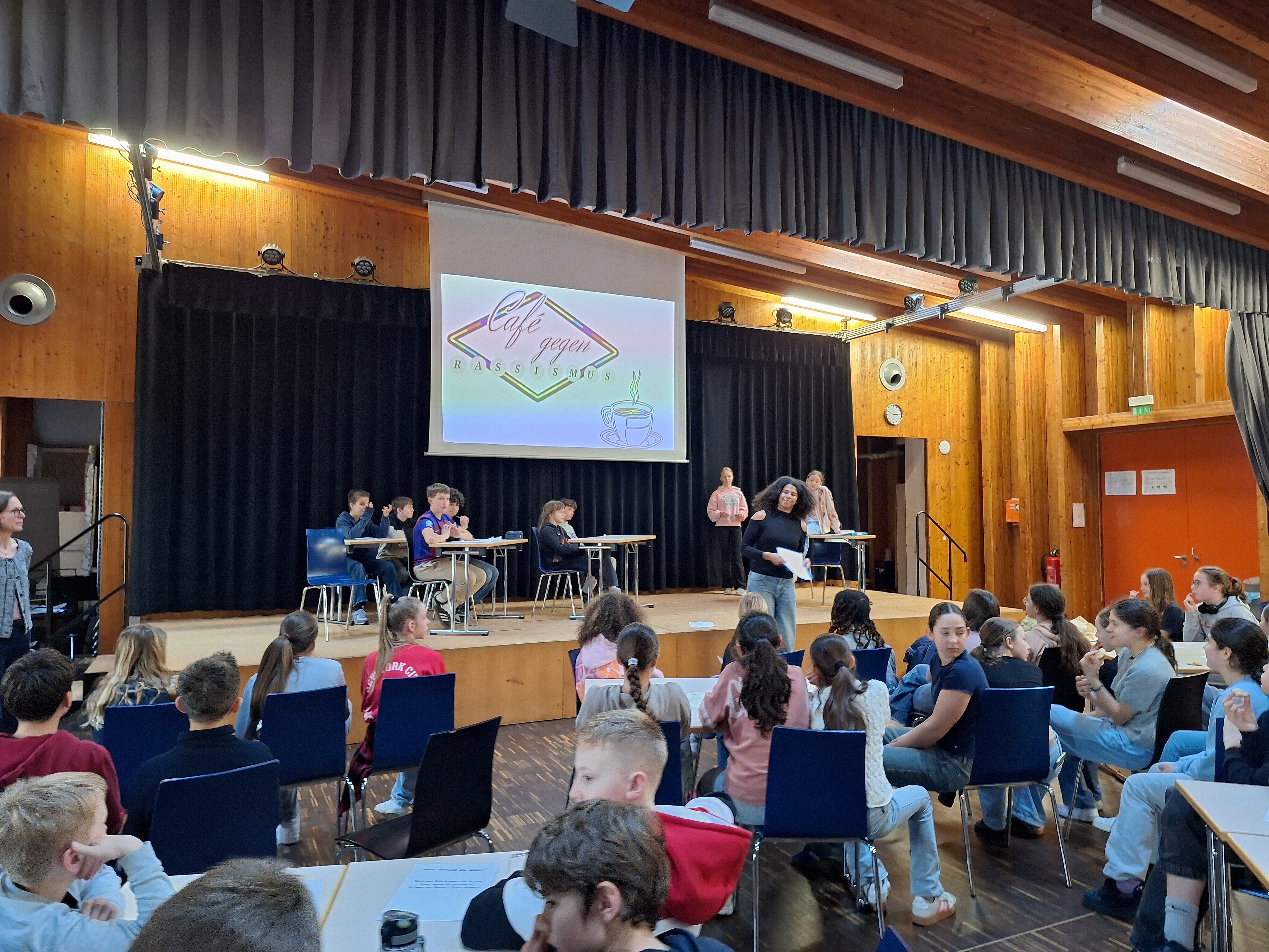 Seit nun vier Jahren sind wir offizielle "Schule ohne Rassismus - Schule mit Courage". Ein Friedensstifter-Team bestehend aus 6. Klässlern hat sich auf den Weg gemacht in der Woche vom 23.-27. März mehrere Projekte umzusetzen. Unterstützt wurde sie von Lehrkräften und unserer Patin gegen Rassismus, Kemi Schulz. Diese hat auch gleich am Montag für alle 6. Klassen einen zweistündigen Workshop abgehalten, in dem die Schüler*innen über das Thema Rassismus und Diskriminierungen informiert und im Hinblick auf unsere Friedensstifter-Werte wie Respekt und Rücksicht sensibilisiert wurden. Ein Höhepunkt war dann das am Donnerstag veranstaltete "Café gegen Rassismus", bei dem die Schüler*innen mit Kemi Schulz eingeübte kleine Theaterrollenstücke aufgeführt haben. Darin wurden konkrete Szenen von Alltagsrassismus vorgespielt - einmal als negatives Beispiel und einmal als positive Handlungsalternative, sodass alle nachempfinden konnten, wie man sich in so einer Situation kompetent und einfühlsam verhalten kann. Dazu gab es ein selbst gestaltetes Kahoot-Quiz sowie einen "Internationalen Basar", zu dem die Schüler*innen kleine Leckerbissen aus verschiedenen Ländern beigetragen haben, sodass man die kulinarische Vielfalt selber "erschmecken" konnte. Der eingenommene Betrag wurde dem Deutsch-Afrikanischen Verein übergeben, der sich für die Verständigung der Kulturen einsetzt.